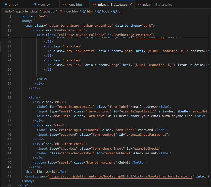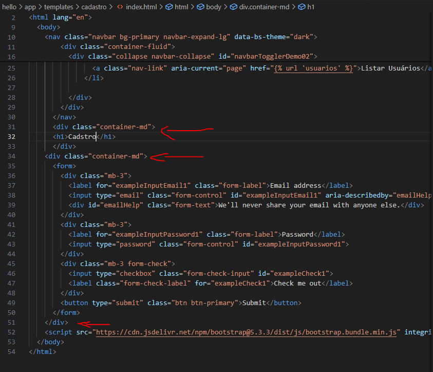 E vou fazer o mesmo com aquele texto hello world dentro do h1 e vou mudar o texto para cadastro, sendo que vou mover ele para antes da div do form, ficando tudo assim:
