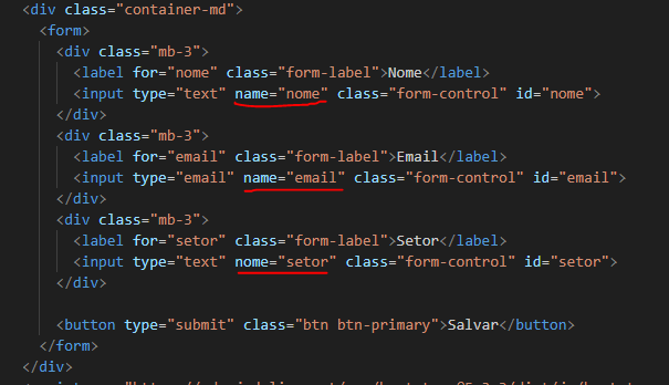 Vou deixar os campos do formuláro somente com nome, email e setor e também vamos colocar o atributo name dentro dos inputs com o seus respectivos nomes, ficando assim o nosso form editado: