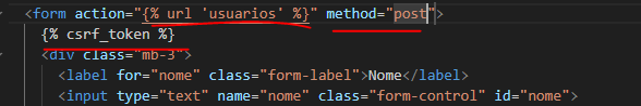 Agora vamos preparar o form para o envio, adicionano o action e o metodo post, devemos incluir também após a tag de abertura do form o csrf_token, necessário para envio de informações de um form para uma página interna.