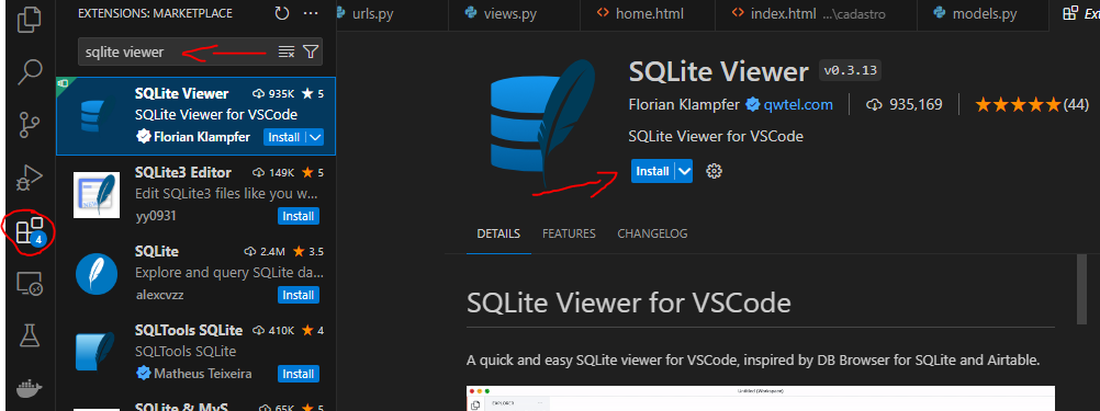 Feito isso vamos instalar a extensão sqlite view para ver como ficou o nosso banco.