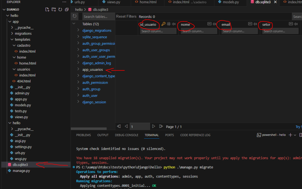 Vamos abrir o banco e visualizar nossa tabela, ela vai estar junto com outras que são nativas do framework.