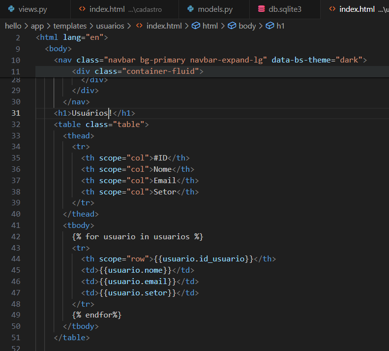 Em seguida vamos criar uma tabela no arquivo html da rota usuarios e colocar um for para percorrer a variável que recebeu as informações do banco, ficando assim: