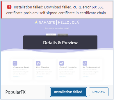 Installation failed: Download failed. cURL error 60: SSL certificate problem: self signed certificate in certificate chain.