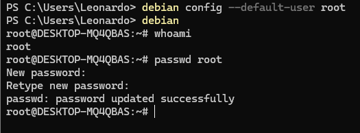passwdroot e pressione Enter. Será solicitado que insira a nova senha e a confirme. - Feche o WSL: Digite